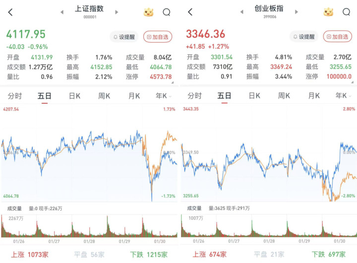 A股三大股指1月30日集体低开。贵金属大幅下挫,导致沪深股指表现低迷,而创指在半导体走强带动下表现强劲。